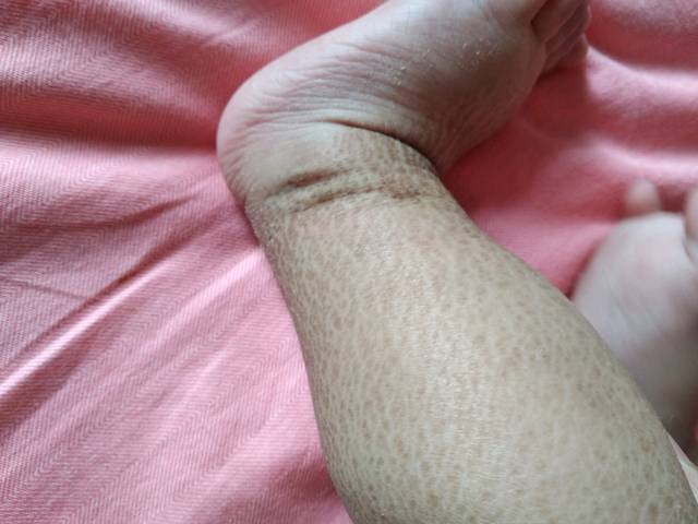 這是一種較為罕見且嚴重的類型,嬰兒出生時全身可能包裹著一層厚厚的鱗屑,隨后這層膜脫落,皮膚表面出現(xiàn)厚重的棕色鱗屑,皮膚顯得非常堅硬。此類型還可能伴有眼瞼、嘴唇外翻等并發(fā)癥。(附上板層型照片)